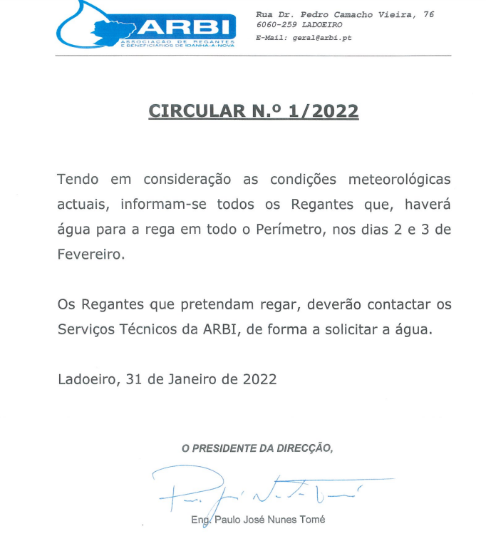Convocatória para a Assembleia Geral da Associação de Regantes e Beneficiários de Idanha-a-Nova (ARBI), em (...)